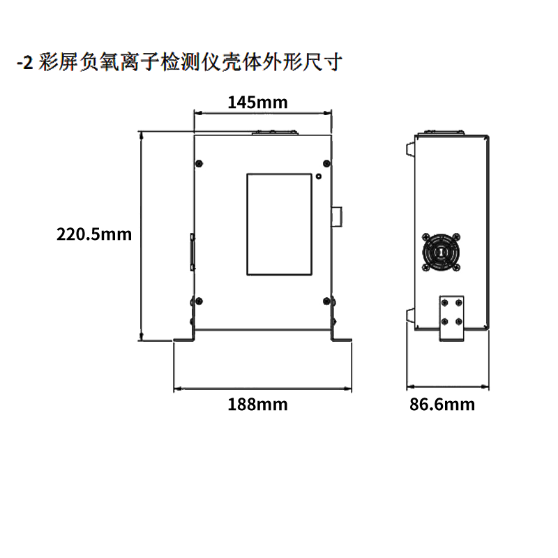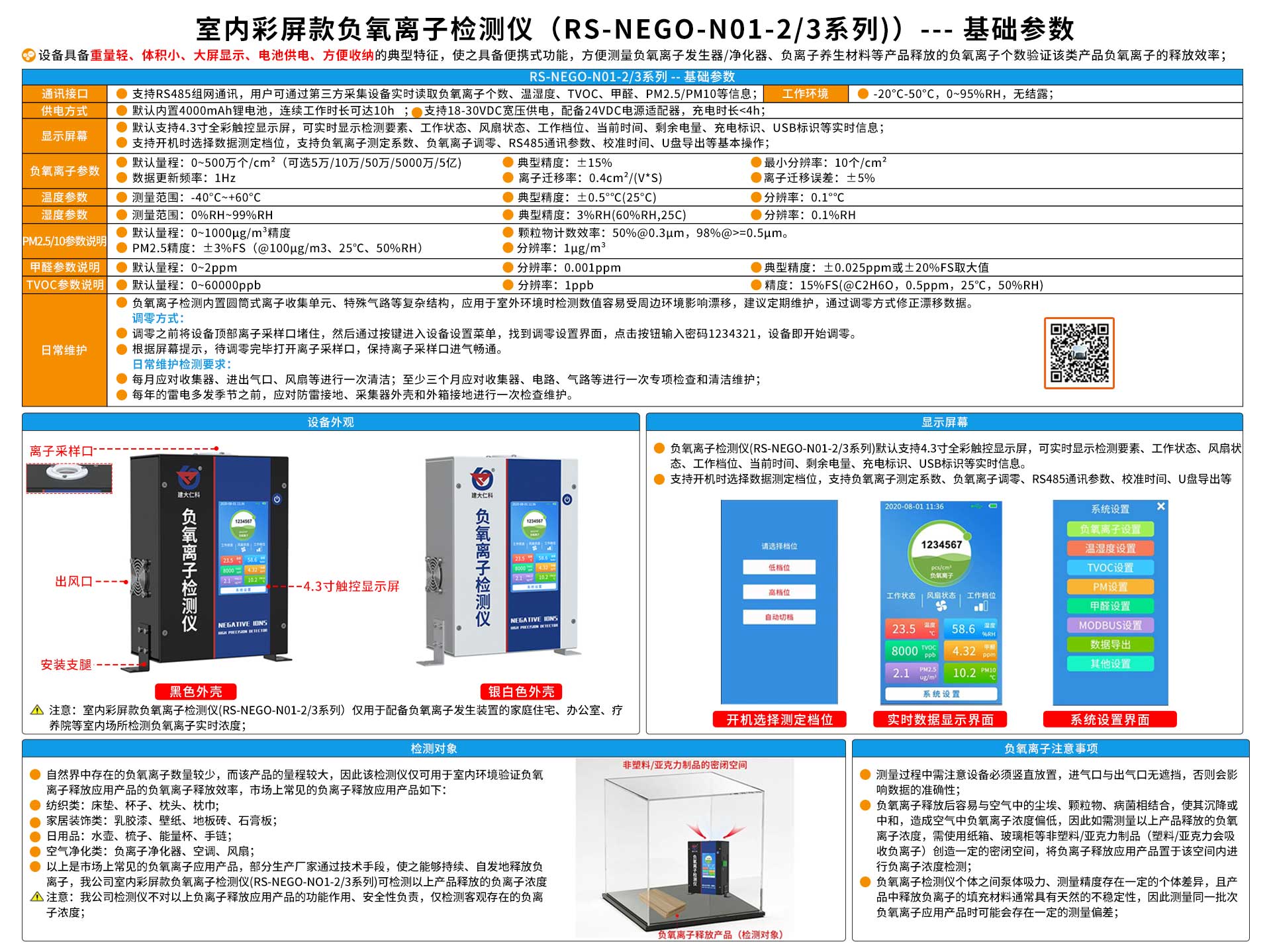| 负氧离子参数 | 默认量程 | 0~500万个/cm3 (可选5万/10万/50万/5000万/5亿) |