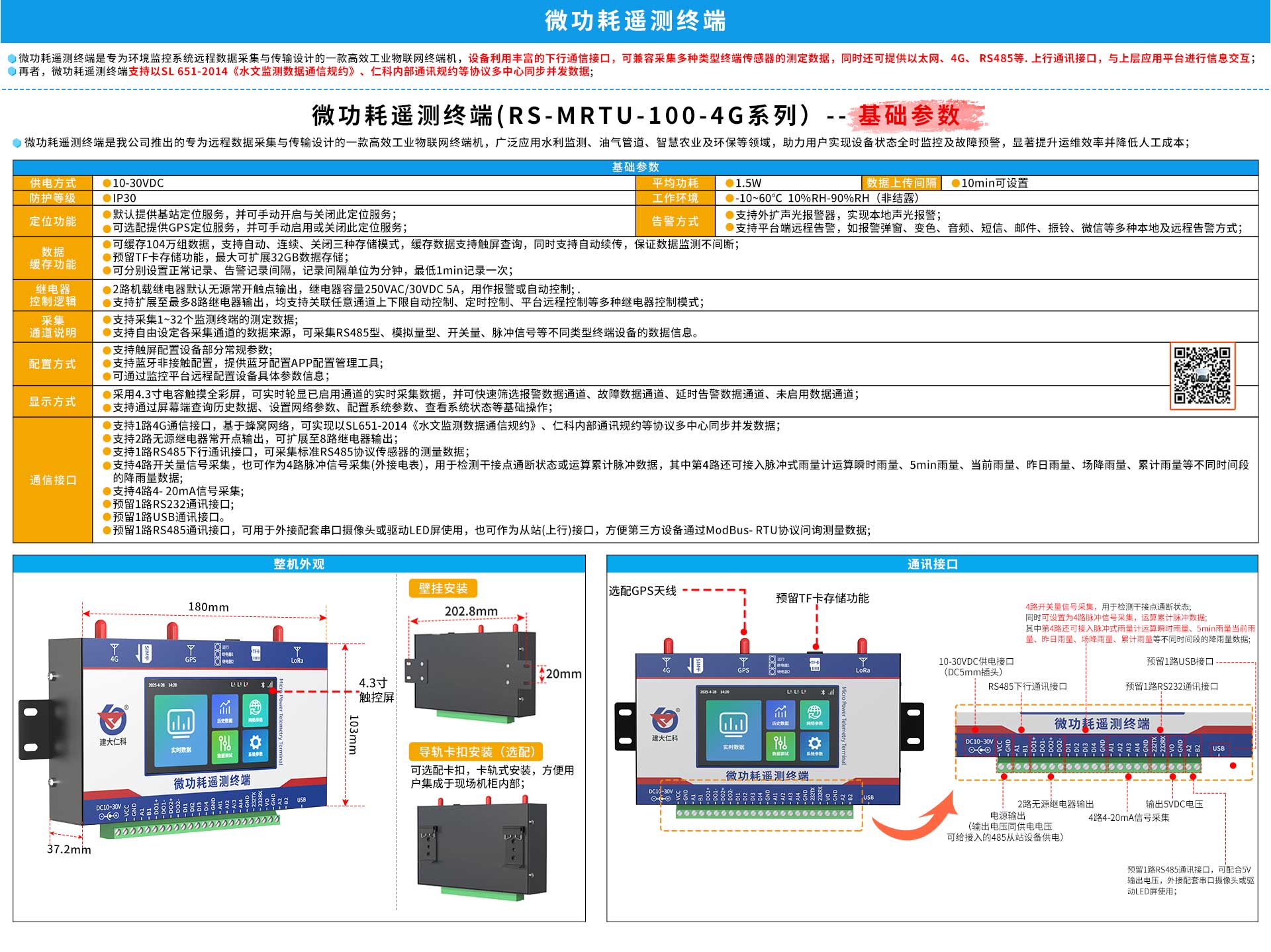 | 4路开关量输入通道 | 可检测干接点通断状态 | 可采集开关量或脉冲计数(外接电表使用);第四路可外接脉冲雨量计 |