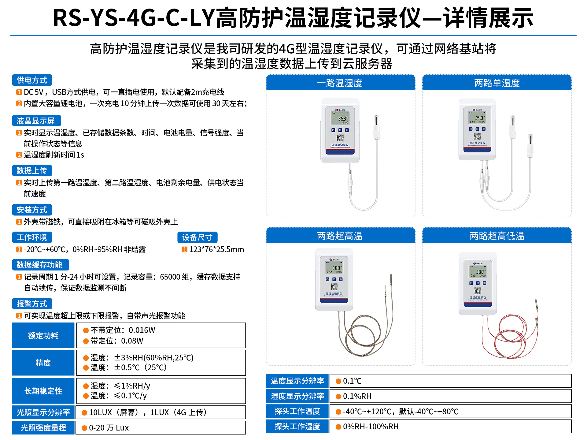| 内部存储 | 记录周期1分-24小时可设置,记录容量:65000组 |
